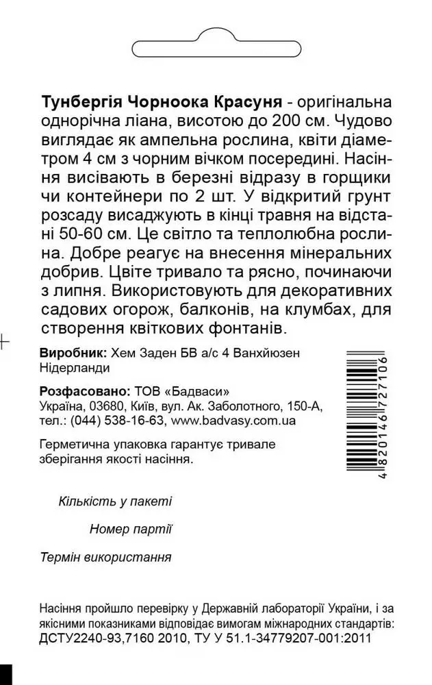 Тунбергія Чорноока Красуня - оригінальна однорічна ліана, висотою до 200 см. Чудово виглядає як ампельна рослина, квіти діаметром 4 см з чорним вічком посередині. Насіння висівають в березні відразу в горщики чи контейнери по 2 шт. У відкритий грунт розсаду висаджують в кінці травня на відстані 50-60 см. Це світло та теплолюбна рослина. Добре реагує на внесення мінеральних добрив. Цвіте тривало та рясно, починаючи з липня. Використовують для декоративних садових огорож, балконів, на клумбах, для створення квіткових фонтанів.
