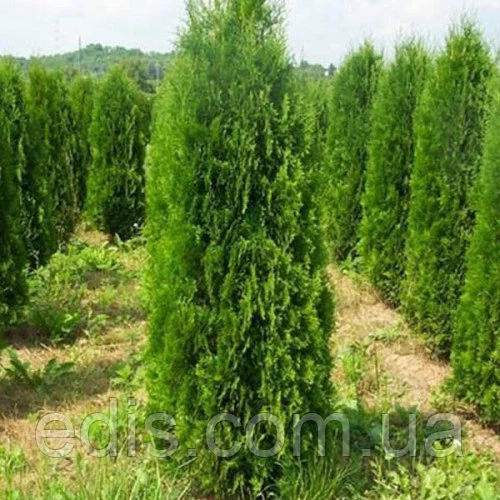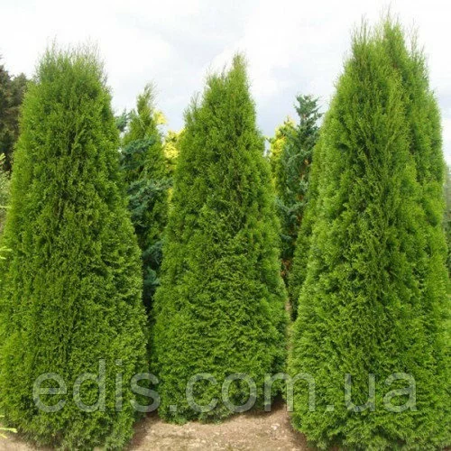Струнка вертикальна колоновидна туя західна. Славиться своїм потужним ростом у висоту. Підходить для живоплотів. Крона правильної форми, не потребує формувальноі стрижки. За 10 років виростає до 3 метрів.