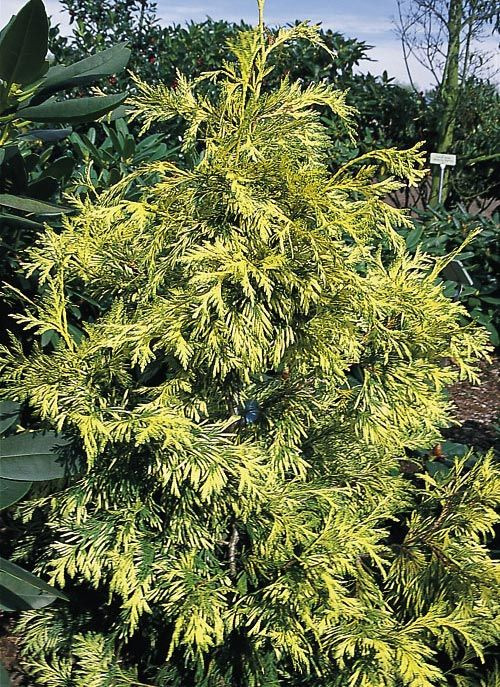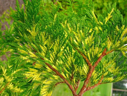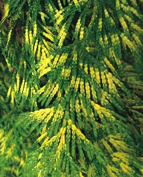 Хвоя: блискуча, лусковидна, плоска, щільно прилегла до розлогих пагонів яскраво-зеленого кольору з жовто-білими поперечними смужками. У зимовий період фактура і колір хвої не змінюється.