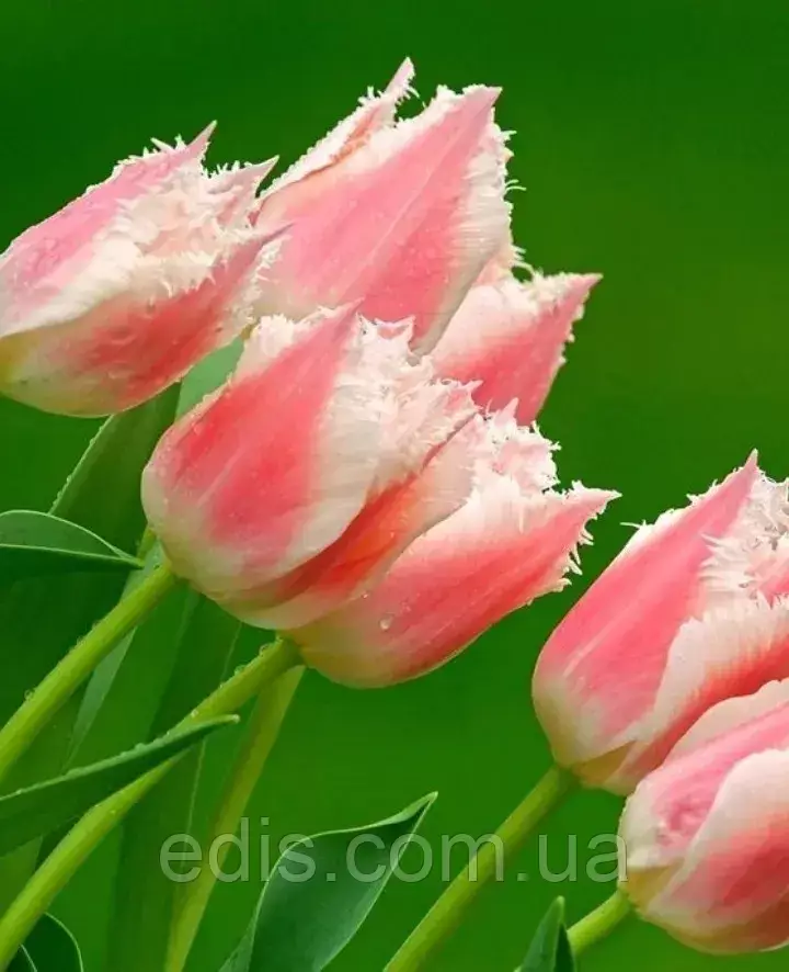 Великі загострені бутони класичної форми з квадратним денцем і пишною білою бахромою, на високих стеблах. Забарвлення квітки яскраво-рожеве з білим денцем, бахрома біла.
