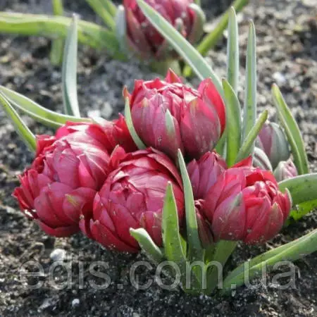 Чарівна новинка в компанії малюків – півонієподібний карликовий тюльпан Саманта. Великі, як для ботанічних сортів, махрові, насичено-червоні квіти. На сонячному місці іноді стебла настільки короткі, що схожі на льодяники бутони сидять на землі. Шикарний тюльпан для газонів, горщиків, альпійських гірок, бордюрів.