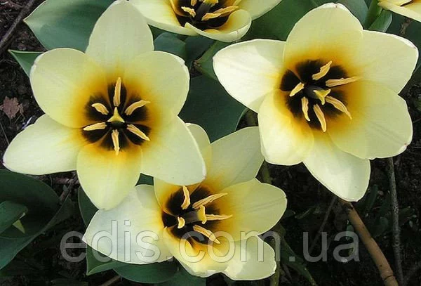 Висота квітконосу 25 див. Келих кольору слонової кістки з масляно-жовтим підсвічуванням від дінця, високий, звужений. Квітки широко відкриваються, показуючи жовте з чорним дінці. Лист великий, зелений.