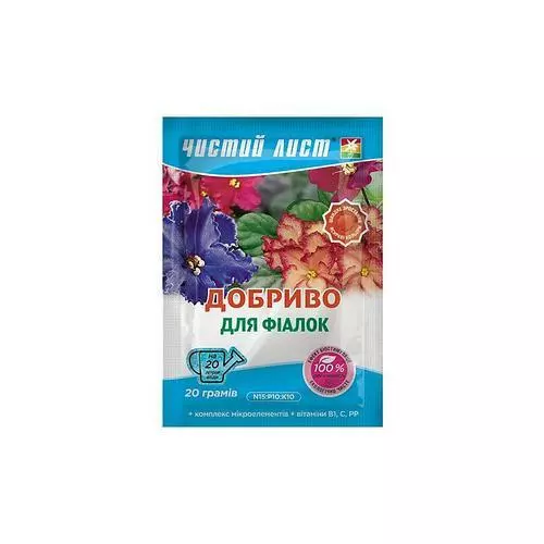 Чистий лист (N8:P10:K10:Mg2) — інноваційне комплексне добриво для фіалок. Являє собою кристалічний порошок, який повністю розчиняється у воді. Застосовується добриво для підживлення фіалок під час росту і цвітіння. До складу препарату входять макро - і мікроелементи, фітогормони і вітаміни — азот, фосфор, калій, магній, залізо, бор, цинк, марганець, молібден, мідь, вітаміни С, РР, В1. Мікроелементи присутні в хелатній формі і легко засвоюються рослинами.
