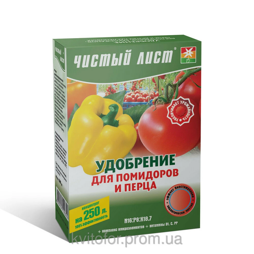 Висококонцентроване добриво використовується для підживлення помідорів і перцю на протязі всього періоду вегетації. Даний засіб повністю забезпечує рослину повноцінним харчуванням, компенсує дефіцит необхідних макро-і мікроелементів. Препарат підвищує опірність до хвороб та несприятливих погодних умов, а також не завдає шкоди навколишньому середовищу.