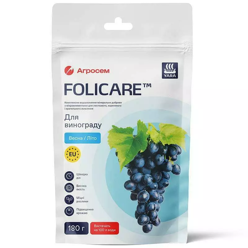 Добриво для винограду Весна-Літо Folicare® - це водорозчинне мінеральне добриво, що містить збалансований комплекс елементів живлення як макро так і мікро речовин, призначене для листкового та кореневого живлення усіх сортів винограду у весняно-літній період.