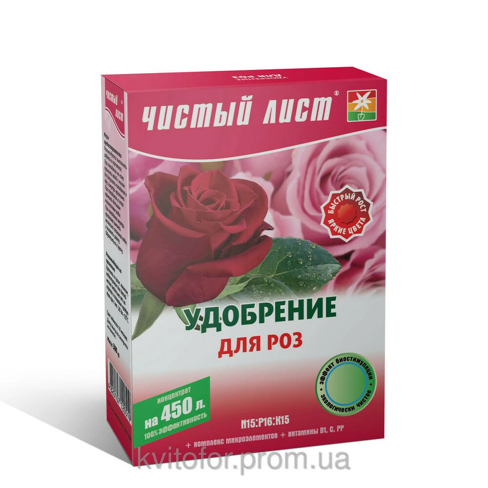 Добриво Чистий Лист (N16:P16:K15:Mg2) — комплекс мікроелементів + фітогормони + вітаміни. Препарат спеціально розроблений для підгодівлі троянд. Рекомендується застосовувати протягом усього сезону і перед настанням заморозків (шляхом сухого внесення в грунт). У препараті міститися макро - і мікроелементи в хелатній (легкозасвоюваній рослинами) формі, а також вітаміни (С, РР, В1) і фітогормони. Водорозчинне добриво безперешкодно проникає в рослину і швидко ліквідує дефіцит поживних речовин.