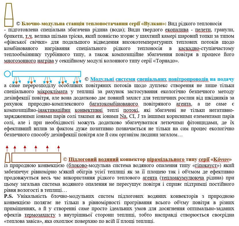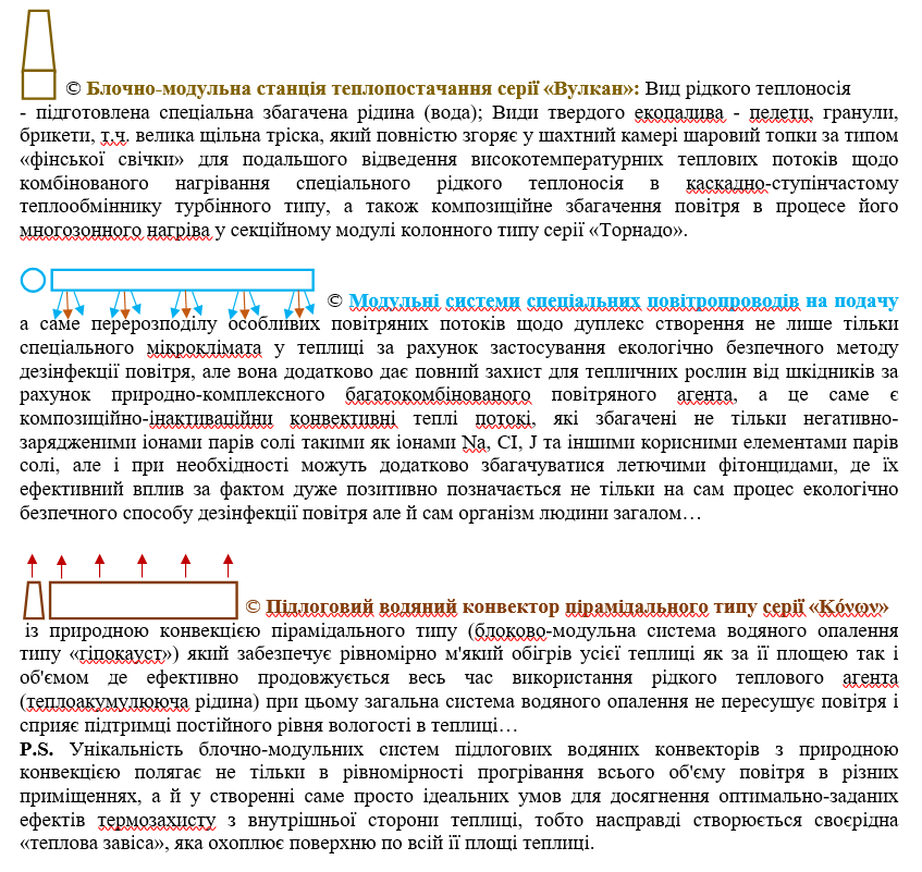 - Блоково-модульні системи щодо конвективно-радіаційного опалення тепличного комплексу з функцією підігріву ґрунту для прискорення росту та репродукування рослин;