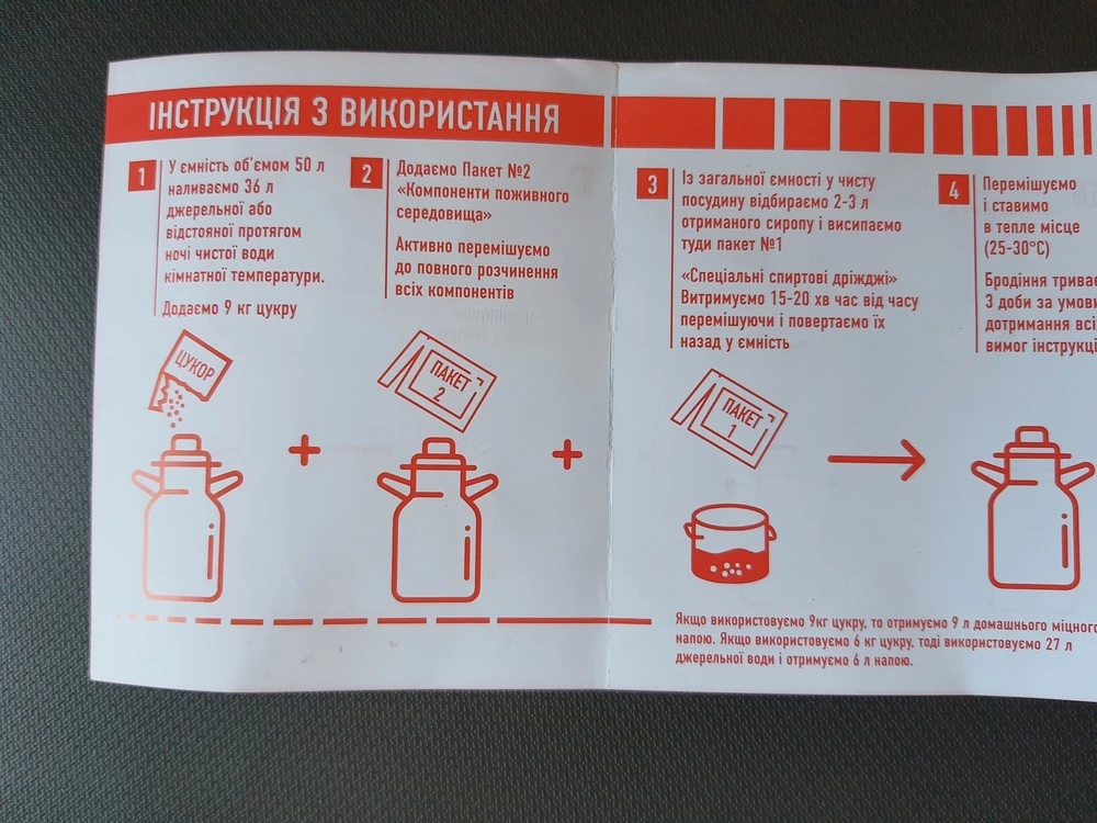 3. Пакет №1 (спеціальні спиртові дріжджі) розводимо у 2-3 літрах виготовленого цукрового сиропу. Витримуємо 15-20 хв. Іноді перемішуючи, вливаємо їх у ємність.