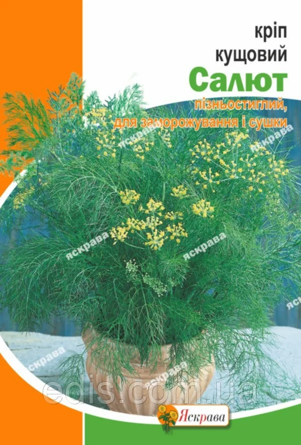 Кріп Салют 20 гСорт пізньостиглий, гіллястий. Зелень ніжна, соковита, інтенсивно зелена. Довгий час зберігає товарні цінності. Сорт призначений для заморожування і сушіння. Багатий хімічний склад забезпечує високу харчову цінність. Смакові якості кропу споріднені з його лікувальними властивостями. Всі частини рослини містять ароматичне масло. Використовують зелень кропу, а взимку і насіння, як приправу до різних страв і салатів. Зелень заготовляють на зиму, для засолювання чи высушивют в тіні, при цьому зберігається її ароматна і інші цілющі властивості. Скоростигла, холодостійка, світлолюбива, не вимоглива до умов вирощування рослина. Сходи з'являються через 10-20 днів і за короткий час утворюють велику масу зелені.