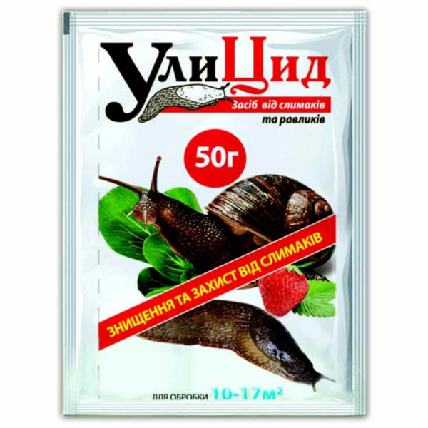Безпечне засіб знищення та боротьби з равликами і слимаками «Улицид» українського виробництва. «Улицид» дуже простий у застосуванні. Необхідно просто розсипати гранули на поверхні ґрунту між рядками і доріжками, приблизно 3-5 гр. на 1 кв. м. Засіб дуже економна, так як потрібно всього одна обробка. Дощ і ранкова роса нітрохи не знизять ефективність препарату. Так як склад «Улицида» включає в себе тільки натуральні компоненти, він абсолютно безпечний для людини, не токсичний для тварин і не має шкідливого впливу на дощових черв'яків і бджіл. Залишки препарату вільно розкладаються грунтовими мікроорганізмами. Це справжній порятунок для саду та городу. Рослини, квітки і плоди цілі, і при цьому мінімально страждають від хімічного впливу.