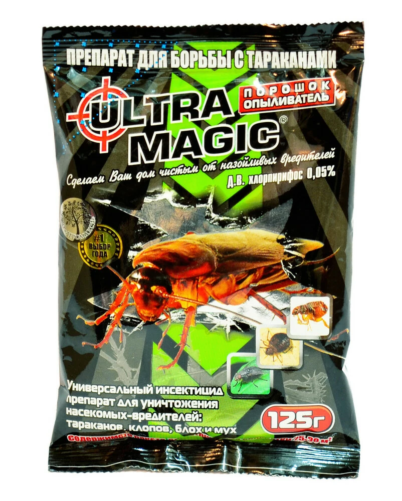 Універсальний інсектицидний препарат для знищення комах-шкідників: тарганів, клопів, мух. Новітня розробка являє собою порошок у складі якого вперше вдалося використати сильне діюча речовина від побутових комах - хлорпирофос. Ультра Магік зробить ваш будинок чистим від настирливих шкідників вже на третій день після застосування. Однієї упаковки препарату 125 г достатньо для обробки приміщення площею до 30 кв. м.