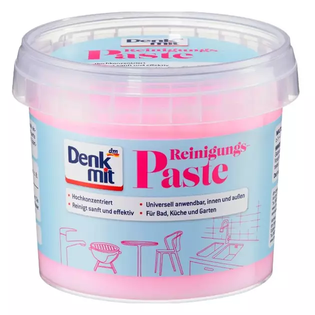 Універсальна паста для чищення Denkmit - це універсальний засіб, який можна використовувати майже для всіх типів забруднень. Завдяки висококонцентрованому, але дбайливому очищенню брудна підлога, жирна плита, спортивне взуття та садові меблі засяють новим блиском. Паста м'яко очищає і дбайливо ставиться до поверхні. Переконайтеся в ефективності універсального засобу для чищення від Denkmit і нехай ваша квартира засяє як нова.