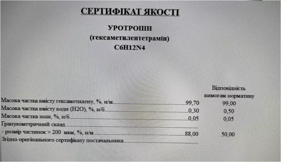 Уротропін (гексаметилентетрамін) – це білий кристалічний порошок, що отримується методом хімічної взаємодії формальдегіду та аміаку. Уротропін дуже широко застосовується у виробництві пластмас, лакових плівок, синтетичного каучуку. Уротропін вкрай необхідний у медицині, як сечогінний препарат та антибактеріальний засіб. В аналітичній хімії він використовується як реагент для виготовлення буферних розчинів.