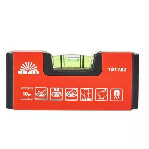 Рівень 10 см з магнітами Vitals застосовується у стисненому просторі або на поверхнях невеликих габаритів. Конструкція інструменту виконана з міцного алюмінієвого сплаву товщиною 1,3 мм, завдяки чому термін служби інструменту вищий. Оснащений однією протиударною акриловою вимірювальною колбою.