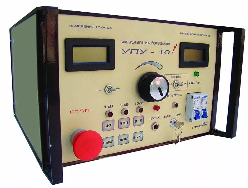 Пропонуємо пробійну універсальну установку УПУ-10М для випробування ізоляції електротехнічного обладнання і матеріалів змінним синусоїдальним напругою частотою 50 Гц і випрямленою напругою негативної полярності, регульованим в межах 0- 10 кВ з вихідним струмом до 100 мА.