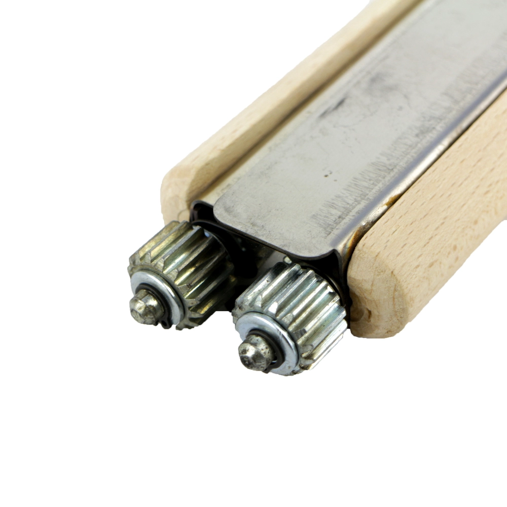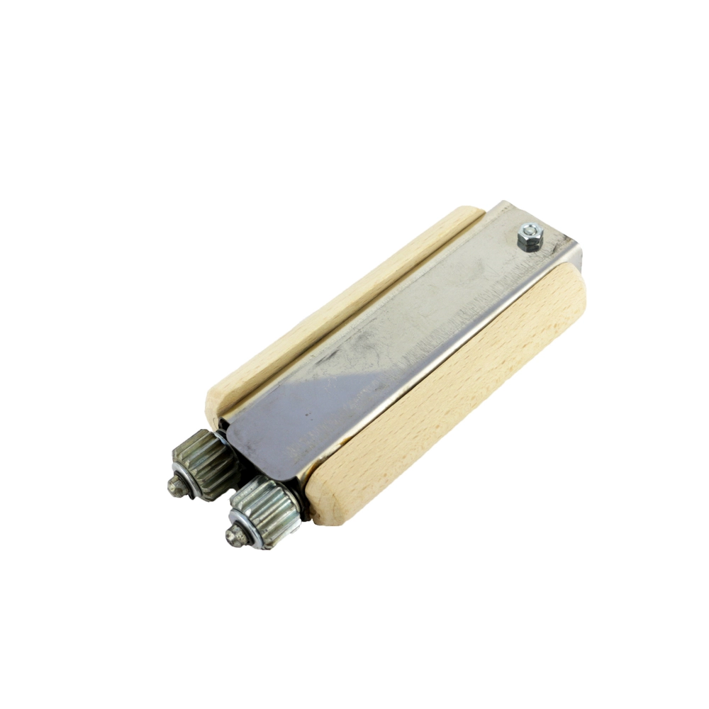 Используется для натягивания слабо натянутой проволоки в рамке. Нить проволоки зажимается между зубчатыми колесиками натяжителя и делается движение ним вдоль проволоки. Таким образом проволока примет волнообразный вид, в результате чего упругость ее повысится. Плоскость волн проволоки должна быть в плоскости вощины. С успехом применяется для повторно навощенных рамок, где проволока растянут, а качество его еще удовлетворительная.