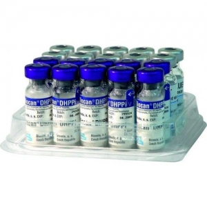 Біокан DHPPi, Biocan DHPPi вакцина жива проти чуми м'ясоїдних, аденовірозу, парвовірозу та парагрипу собак Назва ветеринарного препарату: Біокан DHPPi, Biocan DHPPi – вакцина жива проти чуми м'ясоїдних, аденовірозу, парвовірозу та парагрипу собак. Склад Одна доза (1 мл) вакцини містить: вірус чуми м’ясоїдних (CDV), штам CDVU 39 – 103,0 ТЦІД50 – 104,5 ТЦІД50 аденовірус тип 2, штам CAV-2-Bio 13 – 103,5 ТЦІД50 – 104,5 ТЦІД50 парвовірус (CPV-2), штам CPV-Bio 12 – 104,5 ТЦІД50 – 105,5 ТЦІД50 вірус парагрипу (CPIV-2), штам CPIV-2-Bio 15 – 103,0 ТЦІД50 – 104,2 ТЦІД50 Допоміжні речовини: живильне середовище для ліофілізації – до 1 мл вода для ін’єкцій – 1 мл Фармацевтична форма Ліофілізат і розчинник. Імунобіологічні властивості Після потрапляння в організм вакцинованої тварини антигени, що містяться у вакцині, розпізнаються як сторонні елементи, і в організмі активується ряд захисних механізмів (макрофаги, опсоніни, інтерлейкіни, ?-лімфоцити тощо), внаслідок чого починають формуватися антитіла, специфічні проти антигенних детермінант, що містяться у вакцині. Вказані механізми повинні захищати від наступного розвитку інфекції після зараження. Для підтримання імунітету рекомендується щорічна ревакцинація. Вид тварин Собаки. Показання до застосування Для активної вакцинації собак проти чуми м’ясоїдних, інфекційного гепатиту, інфекційного ларинготрахеїту, парвовірозу та парагрипу собак віком від 6 тижнів. Протипоказання Загальні гіпертермічні захворювання. Застереження при застосуванні Вакцинувати можна лише клінічно здорових тварин з хорошим ступенем вгодованості. Дегельмінтизацію проводити мінімум за 10 днів до вакцинації. Щеплених тварин не слід тренувати або піддавати фізичним навантаженням протягом одного тижня після вакцинації. Взаємодія з іншими засобами Вакцину Біокан DHPPi можна застосовувати окремо або з іншими вакцинами серії Біокан у відповідності зі схемою вакцинації або в комбінації з рідкими вакцинами серії Біокан (Біокан LR, Біокан L, Біокан C, Біокан R). Особливі вказівки при вагітності, лактації Без обмежень. Спосіб застосування та дози 1 мл незалежно від віку, маси та породи тварини. Метод застосування: підшкірно в область під лопатками. Вакцину застосовують тваринам у віці від 6 тижнів. Для підтримання імунітету рекомендується щорічна ревакцинація. Рекомендована схема вакцинації: Схему вакцинації визначає лікар ветеринарної медицини в залежності від епізоотичної ситуації та рівня пасивного імунітету у щеплених тварин, отриманого через колос тральні антитіла. Для підтримання постійного імунітету у вакцинованих тварин рекомендується щорічна вакцинація.