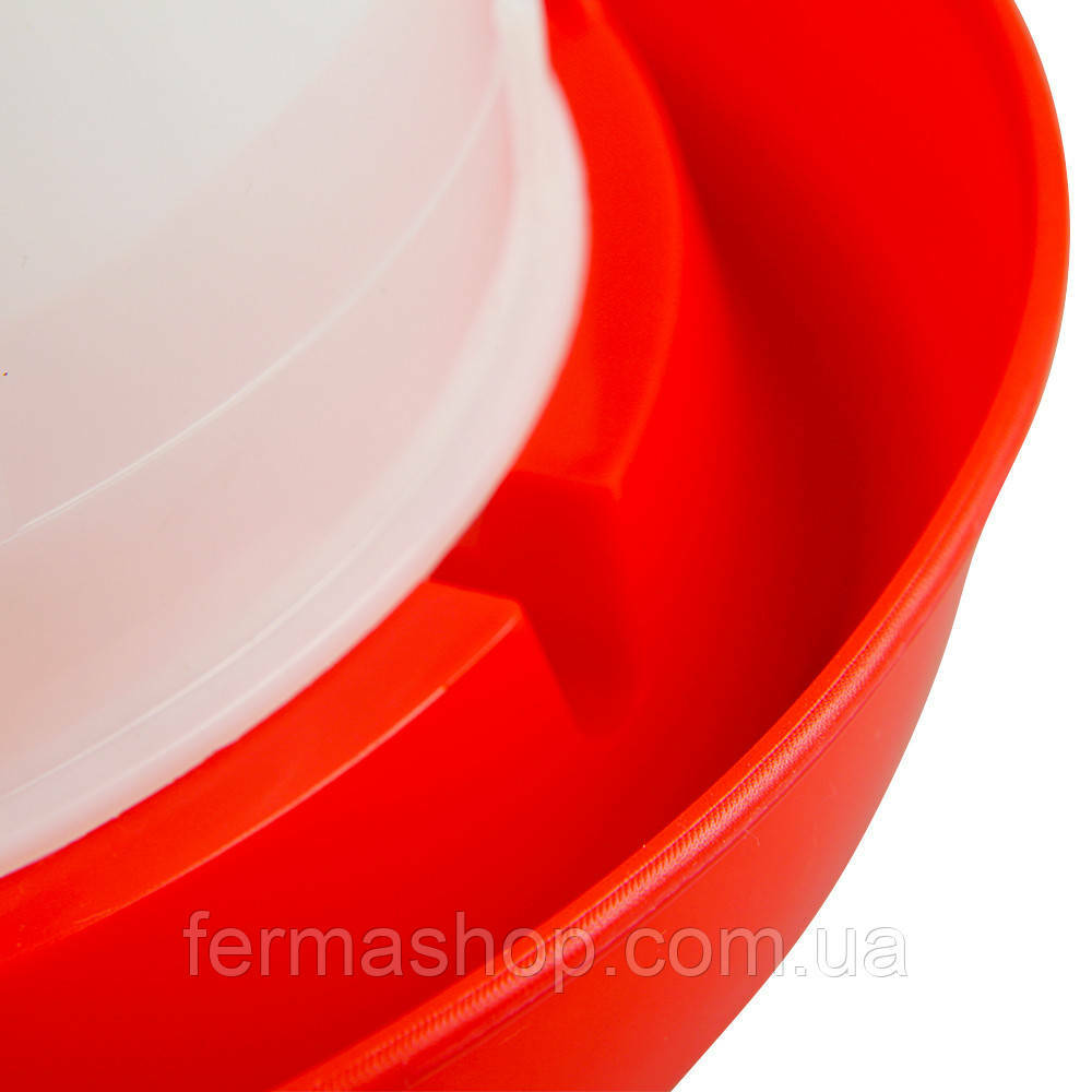 Дно поилки надежно фиксируется к резервуару с помощью защелок, что позволяет удобно переносить поилку, взявшись за пластиковую ручку.