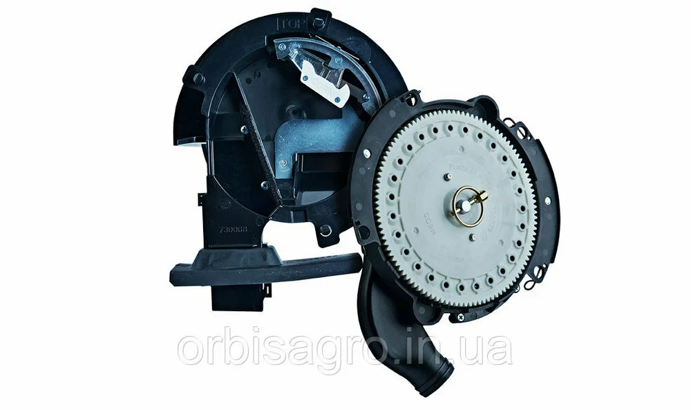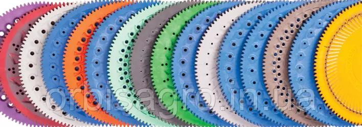 • Висівний диск, виготовлений з полікарбонатного сплаву, що забезпечує високу стійкість до зношування. Диски діляться на однорядні і дворядні, в залежності від висіває культури (кукурудза, соняшник, соя). Зміна диска відбувається також вручну. Необхідно просто зняти фіксуючий шплінт. Поглиблення навколо отворів диска забезпечують відведення пилу, яка може накопичуватися всередині висівного апарату. До висівного апарату можливе підключення системи електроприводу шкірного ряду: