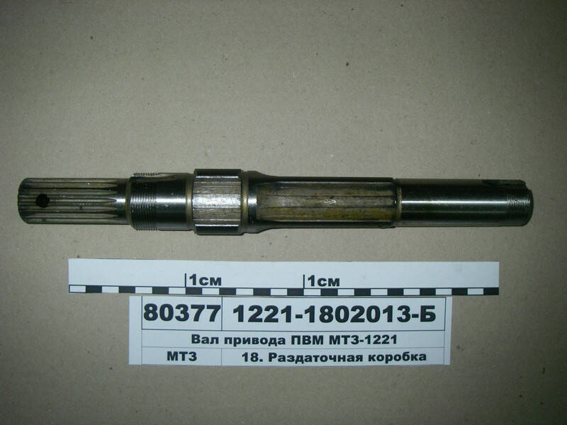 Вал фрикциона привода переднего ведущего моста (шлиц-резьба) устанавливается на тракторах МТЗ-1025, 1221, оригинальный, производства ОАО 'Минский тракторный завод', ОАО 'МТЗ', г. Минск, Республика Беларусь Передний ведущий мост трактора (ПВМ) является объединенными в общий узел механизмами, с помощью которых происходит передача крутящего момента к передним колесам от карданной передачи, обеспечение поворота и стабилизации управляемых колес, передача толкающих усилий остову агрегата от ведущих передних колес. Передний ведущий мост включает в себя балку, главную передачу, дифференциал и колесные редукторы. Конструкция ведущего моста аналогична конструкции неведущего. Тип — портальный, с расположением балки выше оси колес. Благодаря этому достигается высокий агротехнический просвет, который необходим при междурядной обработке пропашных высокостебельных культур. Кожухи полуосей колесных редукторов соединяются телескопически с рукавами переднего моста и имеют возможность бесступенчатого перемещения вместе с колесами относительно рукавов моста, когда изменяется колея трактора. В роли шарниров угловых равных скоростей, которые осуществляют передачу крутящего момента к управляемым колесам от полуосей, выполняют шестерни колесных редукторов. Именно благодаря этому нет ограничения шарнирами углов поворота колес. При таком мосте трактор полностью сохраняет все универсальные параметры базовой модели, такие, как агротехнический просвет, радиусы поворота, пределы регулировки колеи.