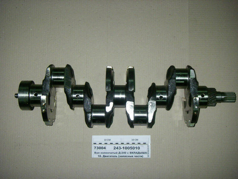 Вал коленчатый применяется на всех 4-х цилиндровых двигателях без турбокомпрессора Д-240, Д-243, устанавливался на тракторах МТЗ-80, 80.1 82, 82.1, 820, 920 до 27.01.2014, комплектуется шестерней к/вала 240-1005030-Д с углом наклона зубьев 28 градусов 58 минут, оригинальный в упаковке, производства ОАО 'УКХ 'Минский моторный завод', ОАО 'ММЗ', г. Минск, Республика Беларусь. Вал коленчатый — деталь кривошипно-шатунного механизма (КШМ) поршневого двигателя внутреннего сгорания всех типов, вал коленчатой конструкции, обеспечивающий преобразование возвратно-поступательного движения поршней и шатунов во вращательное движение связанных с ним деталей силового агрегата и трансмиссии. Именно коленчатый вал составляет основу КШМ любого поршневого мотора внутреннего сгорания, на него возложен целый ряд функций: Преобразование возвратно-поступательного движения во вращательное, которое обеспечивает привод всех остальных агрегатов, Обеспечение центровки и правильного положения деталей поршневой группы в цилиндрах, Смазка шарнирных соединений кривошипно-шатунного механизма — подача масла на коренные и шатунные шейки, а через них по шатунам к поршням. Также вращение вала приводит к образованию масляного тумана в картере, Привод навесных агрегатов двигателя и трансмиссии — передача крутящего момента на моховик и далее на коробку передач, привод газораспределительного механизма, водяного насоса, генератора, вентилятора, компрессора и т.д. От состояния и условий работы коленвала во многом зависят не только параметры всего силового агрегата, но и сама возможность его функционирования. Поэтому коленчатому валу уделяется самое серьезное внимание, а при его неисправностях без промедлений выполняется ремонт или полная замена. Но прежде, чем приобретать новый коленвал, следует разобраться в конструкции, характеристиках и особенностях этой детали мотора.