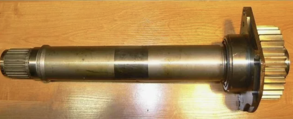 Вал первичный в сборе коробки передач устанавливается на тракторах МТЗ-2522, 2822, 3022, оригинальный, производства ОАО 'Минский тракторный завод', ОАО 'МТЗ', г. Минск, Республика Беларусь Первичный и вторичный валы расположены последовательно, вторичный опирается при этом на подшипник, установленный в хвостовике первичного. Жёсткой связи они не имеют и вращаются независимо друг от друга. Промежуточный вал расположен под первичным и вторичным валами параллельно им, нередко со смещением вбок. На валах находятся блоки шестерён. Чтобы уменьшить шумность работы, шестерни обычно делают косозубыми. На первичном валу находится ведущая шестерня, приводящая промежуточный вал в движение. На промежуточном валу расположен блок промежуточных шестерён, шестерни которого как правило жестко соединены с промежуточным валом и часто изготавливаются как единое целое с ним. На вторичном валу расположены ведомые шестерни, которые могут либо находиться на продольных шлицах вала и свободно перемещаться по ним в продольном направлении (скользящие шестерни), либо свободно вращаться на нём (шестерни постоянного зацепления), в этом случае их продольное перемещение исключено, а передача включается путём присоединения шестерни к валу скользящей на его шлицах муфтой включения передач, часто снабженной механизмом, выравнивающим угловые скорости вала и шестерни — синхронизатором. В несинхронизированных КП спортивных автомобилей или спецтехники для этой же цели часто используются кулачковые муфты.