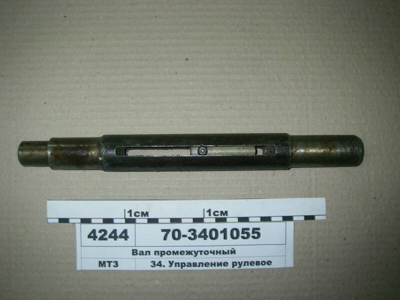 Вал рулевой колонки промежуточный устанавливается на тракторах МТЗ-80, 82, 892, 821, 921, 920, 950, 1025, 1221, 1523, 2022, 3022, оригинальный, производства ОАО 'Бобруйский завод тракторных деталей и агрегатов, 'ОАО 'БЗТДиА', г. Бобруйск, Республика Беларусь Рулевое управление — система управления направлением движения транспортных средств с помощью рулевого колеса. Состоит из механизмов, преобразующих положение (угол поворота) руля в пропорциональное изменение положения колёс или аналогичных управляющих направлением движения элементов Как и компоновка трактора, рулевое управление бывает двух основных видов — поворот передних колёс (аналогично автомобилям), и относительный поворот полурам (тракторы К-700, Т-150К). В компоновке (и рулевом управлении) из двух полурам имеются следующие достоинства: Унификация, простота и надёжность ведущих мостов — они не содержат узлов поворота колёс. Две колеи при любом повороте полурам (задний мост идёт точно по следам переднего), что значительно улучшает проходимость. Поворот полурам позволяет плавно перемещать влево-вправо переднее или заднее навесное орудие, что повышает удобство работы.