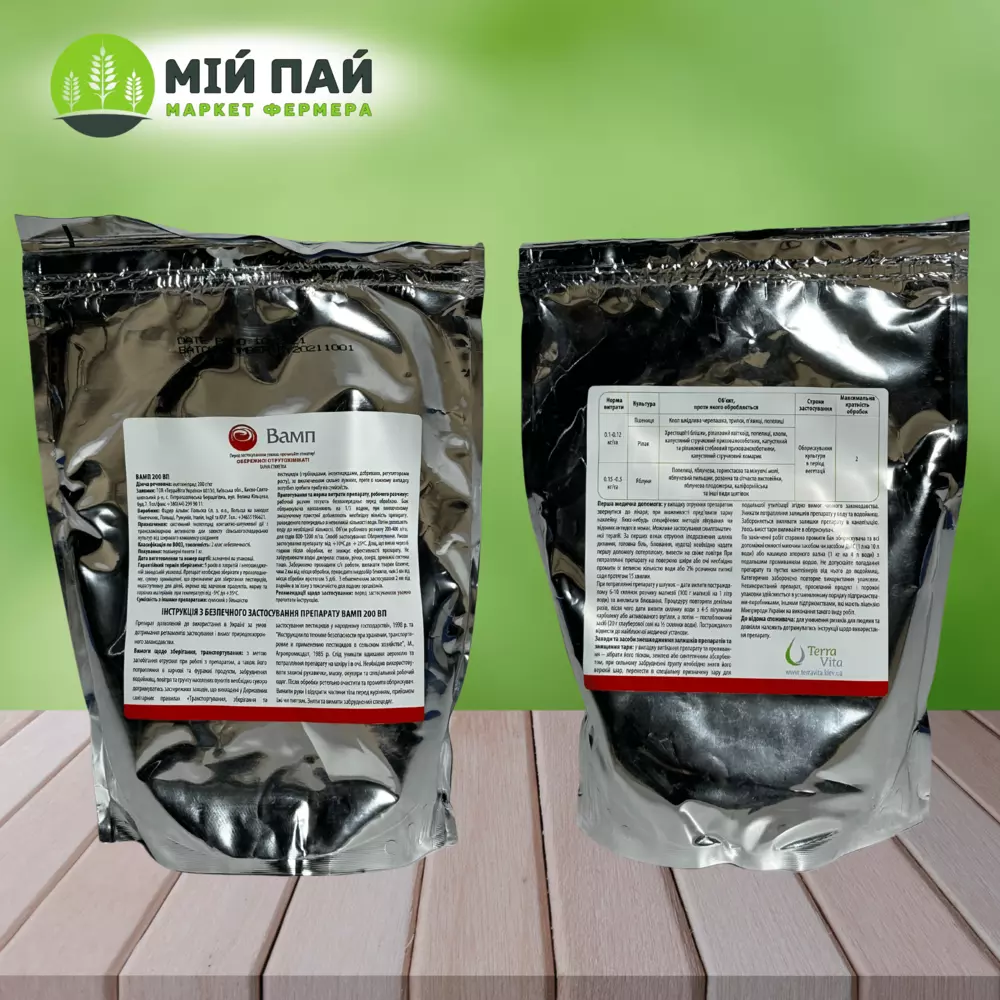 Вамп 200 ВП- Системний інсектицид широкого спектру дії для боротьби з сисними комахами, включаючи попелицю, личинок, листову міль, плодожерку, білокрилку, термітів і деякі види жуків, таких як колорадський жук.