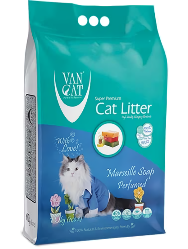 Наповнювач Van Cat Super Premium Quality з марсельським милом виготовляється з натурального білого бентоніту (природний глинистий мінерал), активованого за допомогою кальцинованої соди із застосуванням подвійного просіювання для усунення пилу.