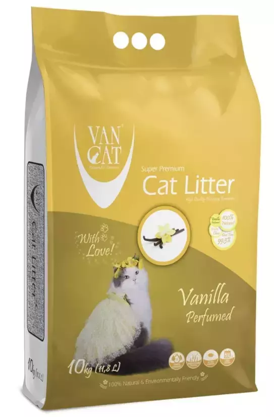 Наповнювач VanCat Super Premium Quality з ароматом ванілі виробляється з натурального білого бентоніту (природний глинистий мінерал), активованого за допомогою кальцинованої соди із застосуванням подвійного просіювання для усунення пилу.