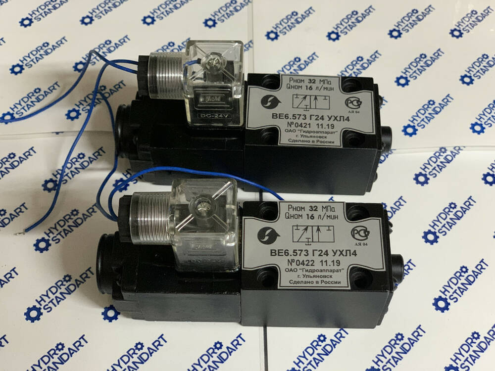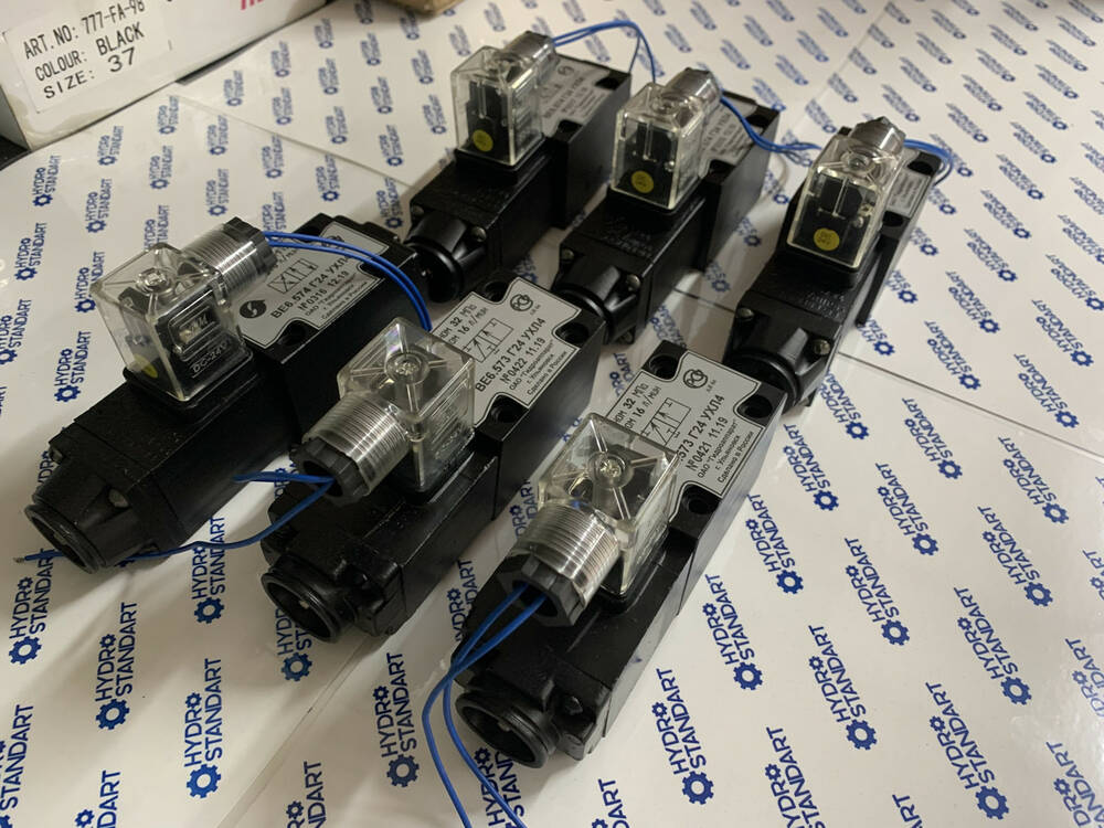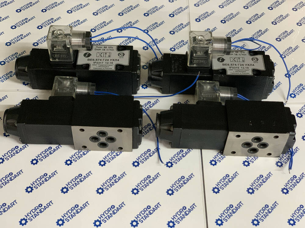Гідророзподільник ВЕ6.574Е та його аналоги ПЕ-6.574Е, 1РЕ-6.574Е, РЕ-6.3.574Е РХ 06.574Е) (Г12, Г24, Г36, Г48, В110, В220, В380) з одностороннім електромагнітним керуванням, імпортний гідророзподільник NG6 RH06 виробництва Туреччини, Німеччини та інших провідних заводів гідравліки з двостороннім електромагнітним керуванням.