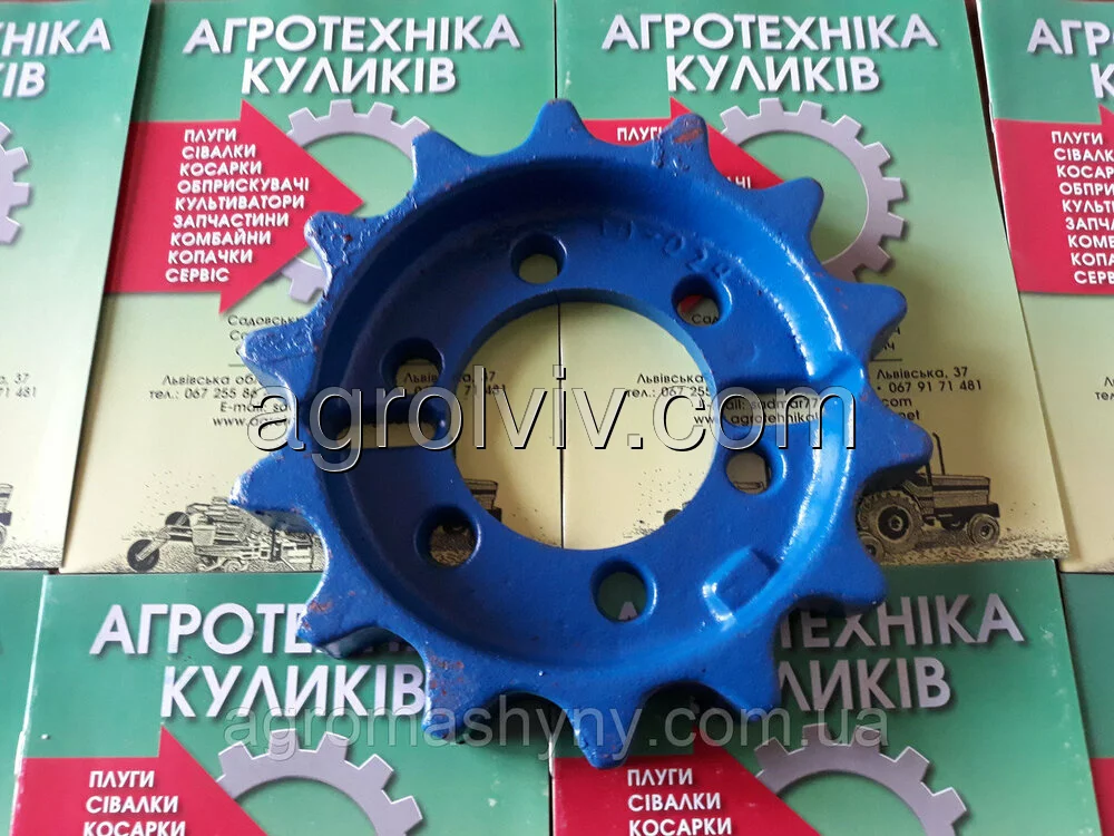 Шестерня ведуча використовується на дворядних причіпних копачках польського виробництва. Це є основна шестерня яка тягне транспортер копачки. Кількість зубів 14 шт. Для встановлення шестерні вал знімати не потрібно. Шестерня розрізається навпіл.