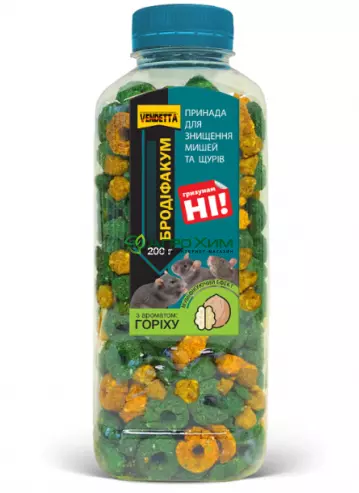 VENDETTA БРОДІФАКУМ - засіб від мишей та щурів яке працює за принципом принада-отрута. Для щурів необхідно розставити приманки по приміщенню, порція 25-50 грамів. Для боротьби з мишами досить порцій розміром 10-25 грам. Загибель гризуна настає через 3-7 діб. Приманки встановлюються на відстані 2-15 метрів, в залежності від кількості гризунів. Ревізію приманок проводити через 1-2 дні з моменту першої розкладки гранул, після чого ревізія проводиться через тиждень. При необхідності процедуру повторити, до повного знищення.