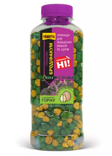 VENDETTA БРОДІФАКУМ - засіб від мишей та щурів яке працює за принципом принада-отрута. Для щурів необхідно розставити приманки по приміщенню, порція 25-50 грамів. Для боротьби з мишами досить порцій розміром 10-25 грам. Загибель гризуна настає через 3-7 діб. Приманки встановлюються на відстані 2-15 метрів, в залежності від кількості гризунів. Ревізію приманок проводити через 1-2 дні з моменту першої розкладки гранул, після чого ревізія проводиться через тиждень. При необхідності процедуру повторити, до повного знищення.
