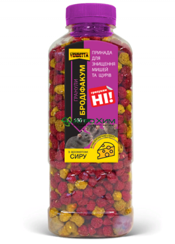 VENDETTA БРОДІФАКУМ - засіб від мишей та щурів яке працює за принципом принада-отрута. Для щурів необхідно розставити приманки по приміщенню, порція 25-50 грамів. Для боротьби з мишами досить порцій розміром 10-25 грам. Загибель гризуна настає через 3-7 діб. Приманки встановлюються на відстані 2-15 метрів, в залежності від кількості гризунів. Ревізію приманок проводити через 1-2 дні з моменту першої розкладки гранул, після чого ревізія проводиться через тиждень. При необхідності процедуру повторити, до повного знищення.