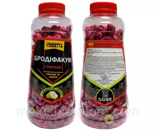 VENDETTA БРОДІФАКУМ - засіб від мишей та щурів яке працює за принципом принада-отрута. Для щурів необхідно розставити приманки по приміщенню, порція 25-50 грамів. Для боротьби з мишами досить порцій розміром 10-25 грам. Загибель гризуна настає через 3-7 діб. Приманки встановлюються на відстані 2-15 метрів, в залежності від кількості гризунів. Ревізію приманок проводити через 1-2 дні з моменту першої розкладки гранул, після чого ревізія проводиться через тиждень. При необхідності процедуру повторити, до повного знищення.