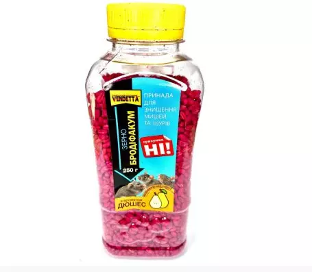 VENDETTA БРОДІФАКУМ - засіб від мишей та щурів яке працює за принципом принада-отрута. Для щурів необхідно розставити приманки по приміщенню, порція 25-50 грамів. Для боротьби з мишами досить порцій розміром 10-25 грам. Загибель гризуна настає через 3-7 діб. Приманки встановлюються на відстані 2-15 метрів, в залежності від кількості гризунів. Ревізію приманок проводити через 1-2 дні з моменту першої розкладки гранул, після чого ревізія проводиться через тиждень. При необхідності процедуру повторити, до повного знищення.