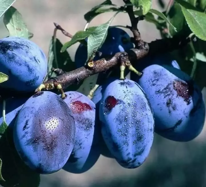 Плоди мають довгасту овальну форму, темно-синього кольору у сизому відтінку, середньою вагою 25-50 г. М'якуш щільний, соковитий, від жовтого до оранжевого кольору іноді з червонуватим відтінком, помірно щільний, соковитий. Кісточка невелика, добре відділяється від м’якоті.