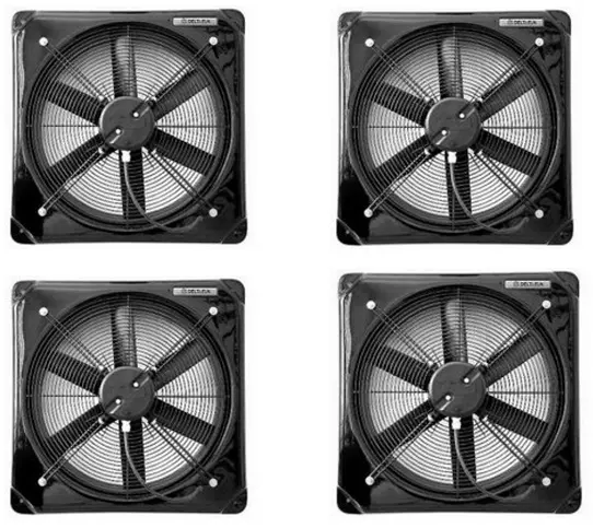 Двигатели вентиляторов – асинхронные, однофазные 230В/50Гц или трёхфазные 400В/230В/50Гц. Однофазные двигатели приспособлены к регулированию напряжением скорости вращения, а трёхфазные – к регулированию с помощью преобразователя частоты (инвертора) и в стандартной версии термозащиты.