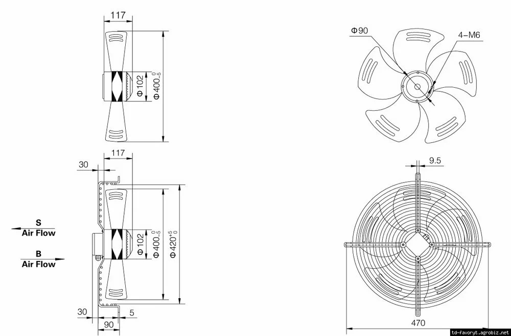 5. Направление воздуха: S – просасывание (на решетку); B – проталкивание (от решетки)