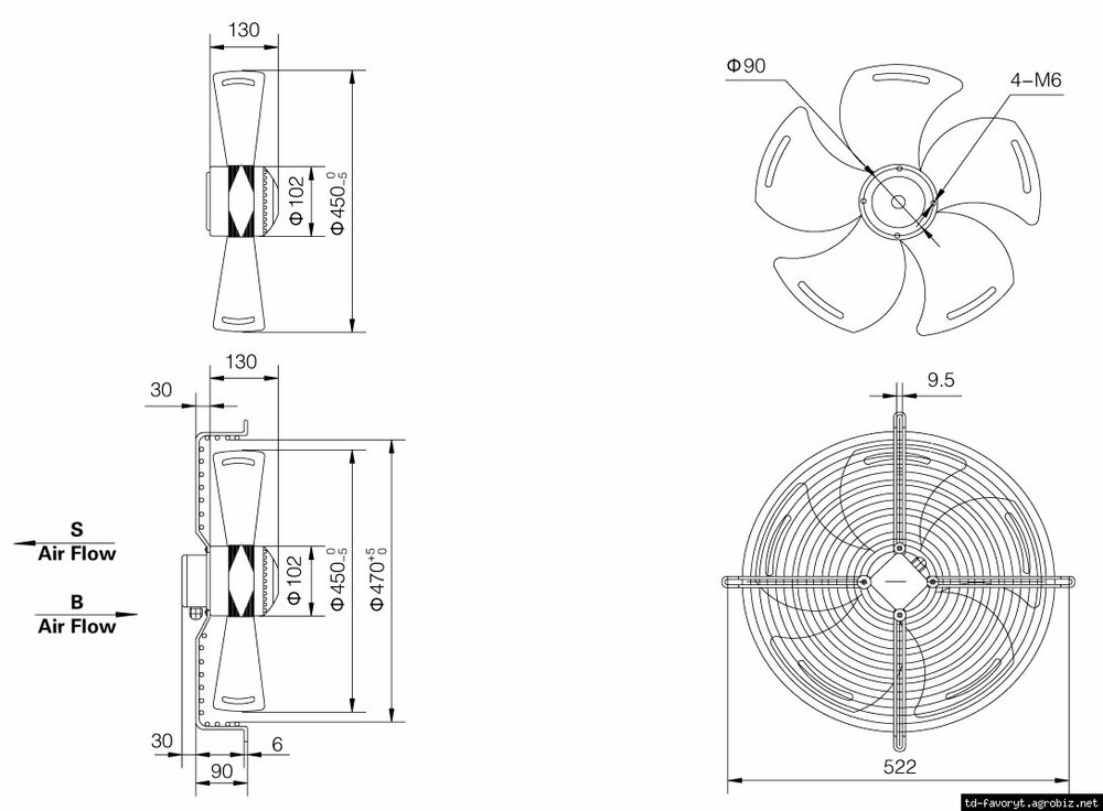 5. Направление воздуха: S – просасывание (на решетку); B – проталкивание (от решетки)