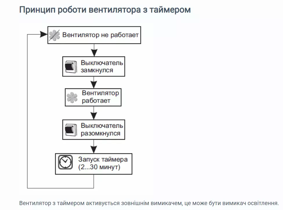Вбудований таймер вимикає вентилятор не відразу після спрацьовування вимикача, з затримкою за часом. Час можна виставити від 2 до 30 хвилин самостійно. Наприклад, людина виходить із кухні та натискає на вимикач. Вентилятор і далі працює виставлений час, , а потім вимикається.