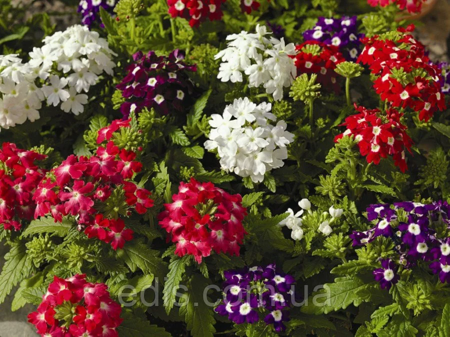 Суміш сортів низькорослої вербени виділяється багатством забарвлень від темно-синього до ніжно-рожевого. Відмінний вибір для швидкого створення яскравого квітника в саду або на балконі. Даний сорт отримав широке поширення в Україні завдяки яскравого, насиченого, витонченому окрасу і невибагливості у догляді.
