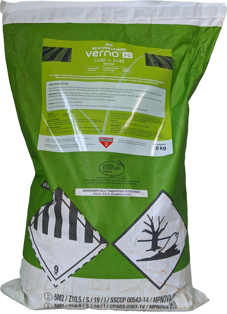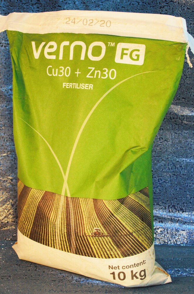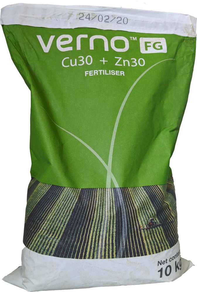 Verno FG Cu30 + Zn30 містить мікронізовані частки оксиду міді і оксиду цинку, які сильно прилипають до поверхні рослин, забезпечуючи резервуар з повільним вивільненням міді і цинку, який забезпечує поживними речовинами, коли це необхідно рослині.