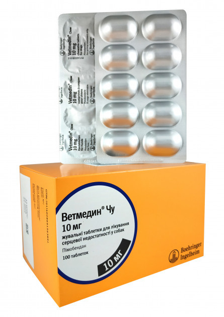 Ветмедин ( Vetmedin) 10 мг. 100 табл. є високо ефективним препаратом для лікування серцево-судинної недостатності у собак. Діюча речовина Пимобендан (Pimobendan). Даний препарат призначається ветеринарним лікарем і дозування встановлюється виходячи з аналізів і загального стану тварини. Застосовується тільки собакам.
