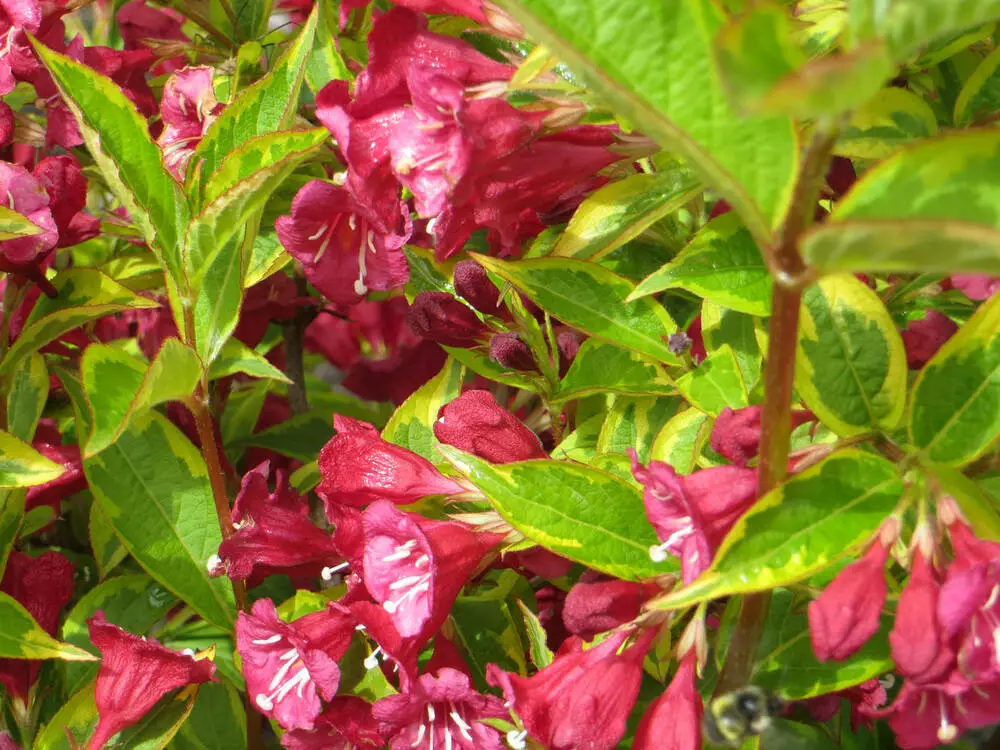 Загальне: декоративно-листяний красивоквітучий чагарник з мальовничо-звисаючими бічними гілками. Молоді пагони червоно-бурі, згодом сірі. Пагони пряморослі, але бічні з віком звисають. Листя оригінально пофарбоване в зелений колір із нерівномірною жовтою облямівкою. Довго залишаються на гілках. Цвіте рясно, яскравими кармінно-рожевими квітами. Квіти дзвонові, одиночні або зібрані в суцвіття по 3-4 шт - рясно покривають кущ під час цвітіння. Цвіте з травня до липня. Повторне цвітіння наприкінці серпня – на початку вересня.