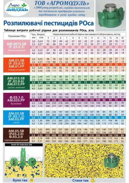 Відцентрові розпилювачі  РОса ( світло-зелений)  015.SB-b (P.03.0.6) на обприскувачі з баком 2000 літрів при швидкості 14 км/год дозволяють провести обприскування на площі 40 га однією заправкою. Виробництво АГРОМОДУЛЬ. При покупці комплекту розпилювача ключ додається безкоштовно.