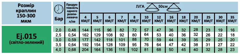 Можливість працювати нормою виливу від 60 до 90 л/га при робочому тиску від 2-х до 4-х атм. і швидкості руху 8-10 км/г за рахунок дрібної краплі і покриття більше 80% загальної площі рослини. Для роботи на більш високих швидкостях дивіться норми виливу в таблиці.