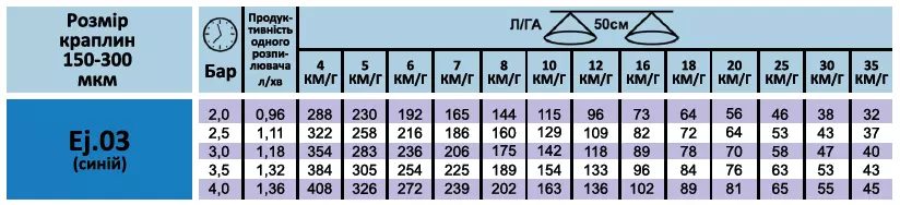 Можливість працювати нормою виливу від 115 до 180 л/га при робочому тиску від 2-х до 4-х атм. і швидкості руху 8-10 км/г за рахунок дрібної краплі і покриття більше 80% загальної площі рослини. Для роботи на більш високих швидкостях дивіться норми виливу в таблиці.