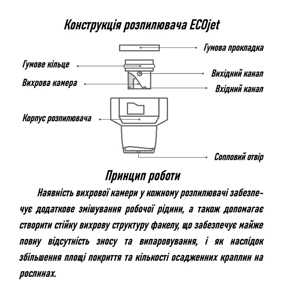 Відцентрові розпилювачі ECOjet створюють 90º конусну модель розпилення з дрібним розміром крапель і примусовим осадженням робочої рідини на поверхню рослини. Ці розпилювачі ідеально підходять для роботи на навісних, причіпних і самохідних обприскувачах за всіма видами с/г культур. Дрібний розмір крапель, краще проникнення в густу масу рослини і рівномірне покриття листя більш ніж на 80% робить цей розпилювач ідеальним інструментом для внесення інсектицидів, фунгіцидів, листових добрив та інших ЗЗР.